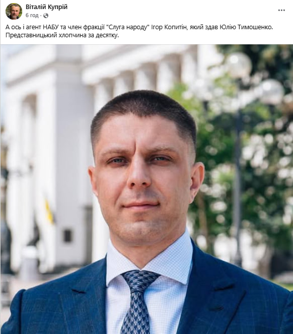 «А вот и агент НАБУ и член фракции «Слуга народа» Игорь Копытин, который сдал Юлию Тимошенко. Представительный парень за десятку», – заявил Куприй.