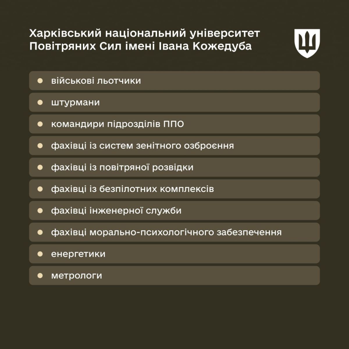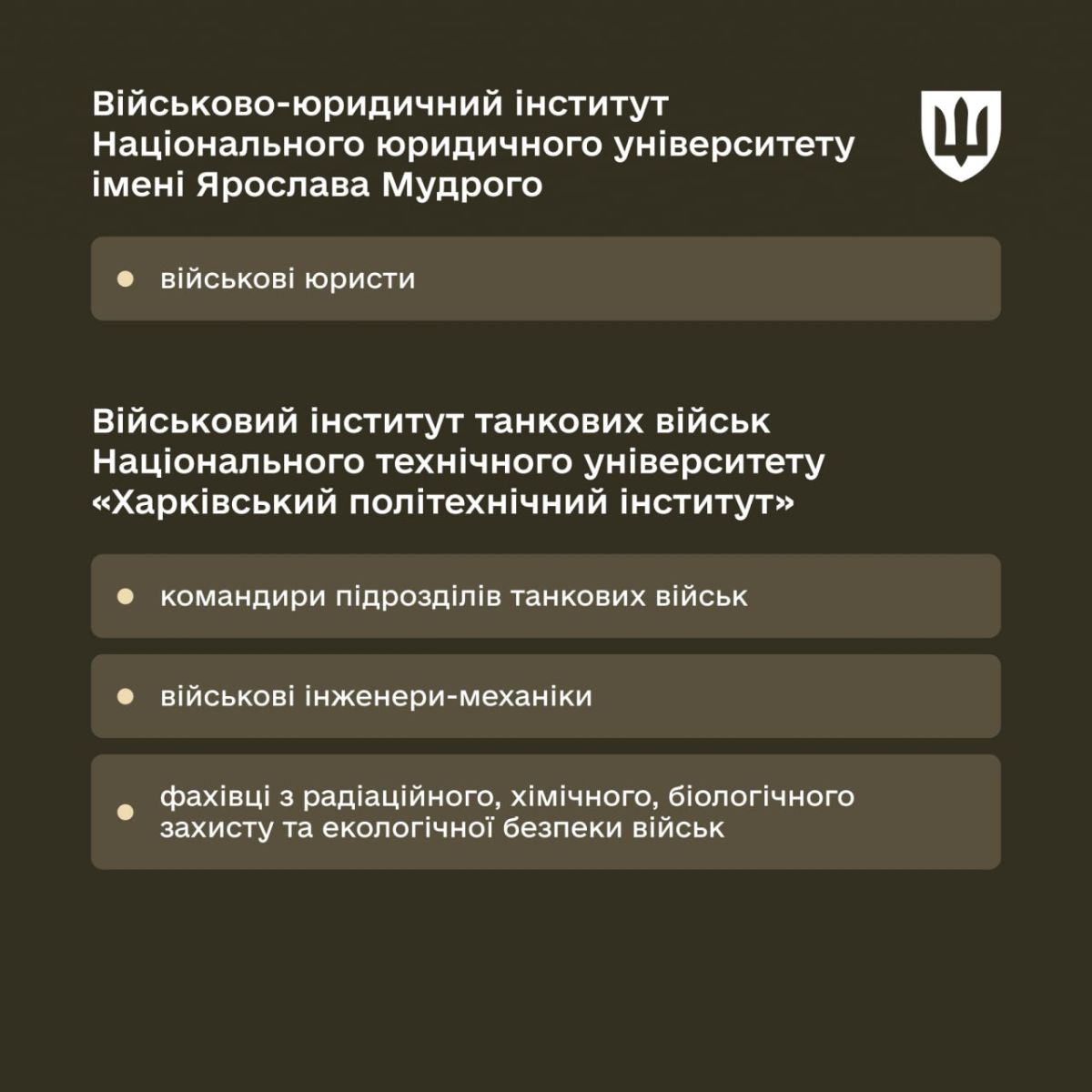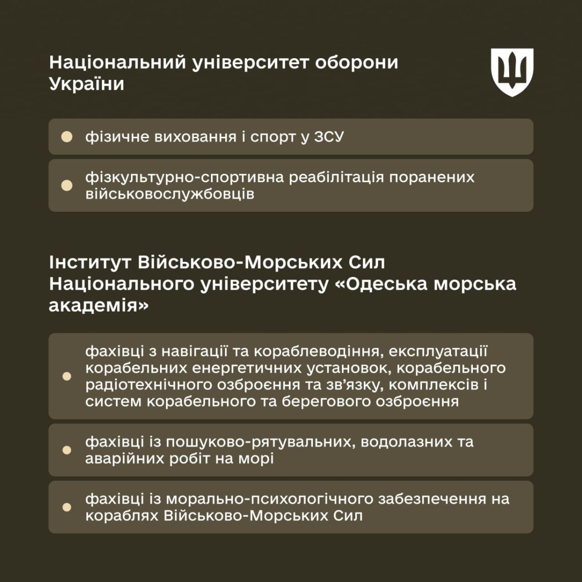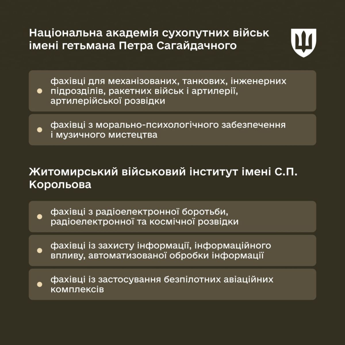 - Национальная академия сухопутных войск имени Петра Сагайдачного – специалисты для механизированных, танковых, инженерных подразделений, артиллерии, морально-психологического обеспечения и музыкального искусства.