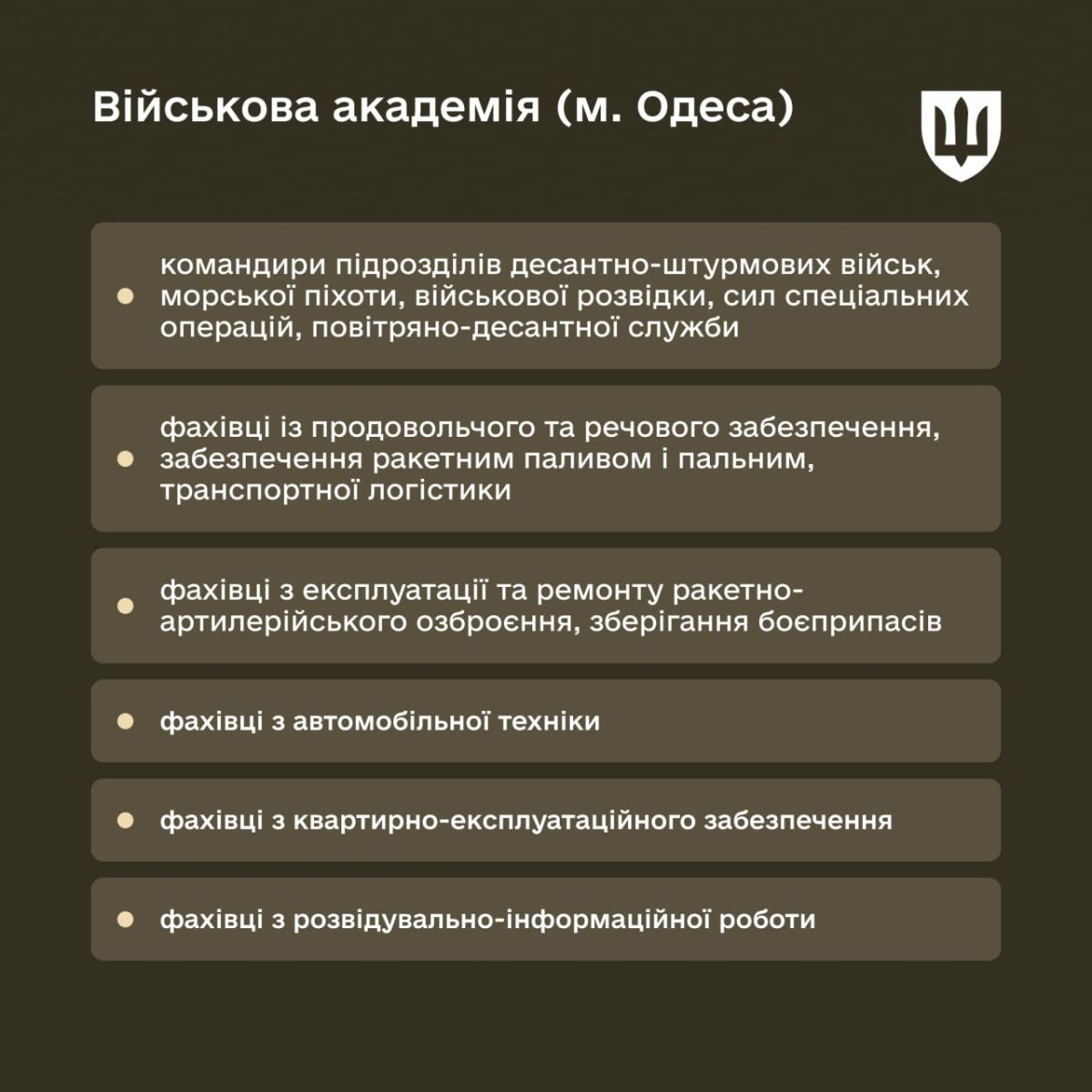 - Военная академия (г. Одесса) – подготовка командиров десантно-штурмовых войск, морской пехоты, разведки и ССО, специалистов по логистике, вооружению и разведывательно-информационной работе.