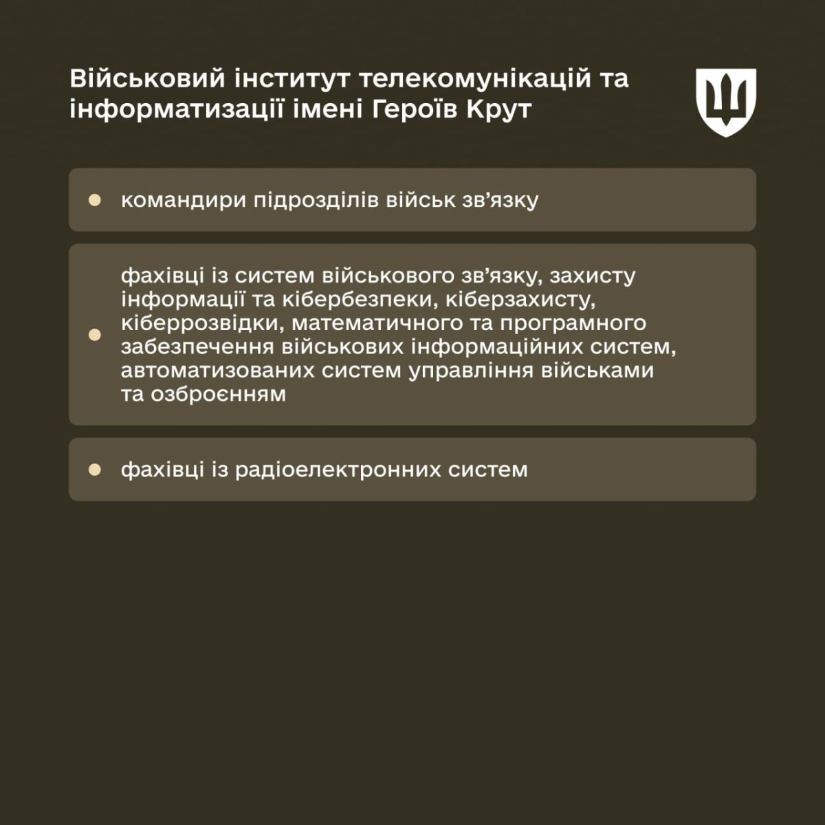 - Военный институт телекоммуникаций и информатизации имени Героев Крут – командиры подразделений связи, киберзащиты, киберразведки и специалисты по автоматизированным системам управления.