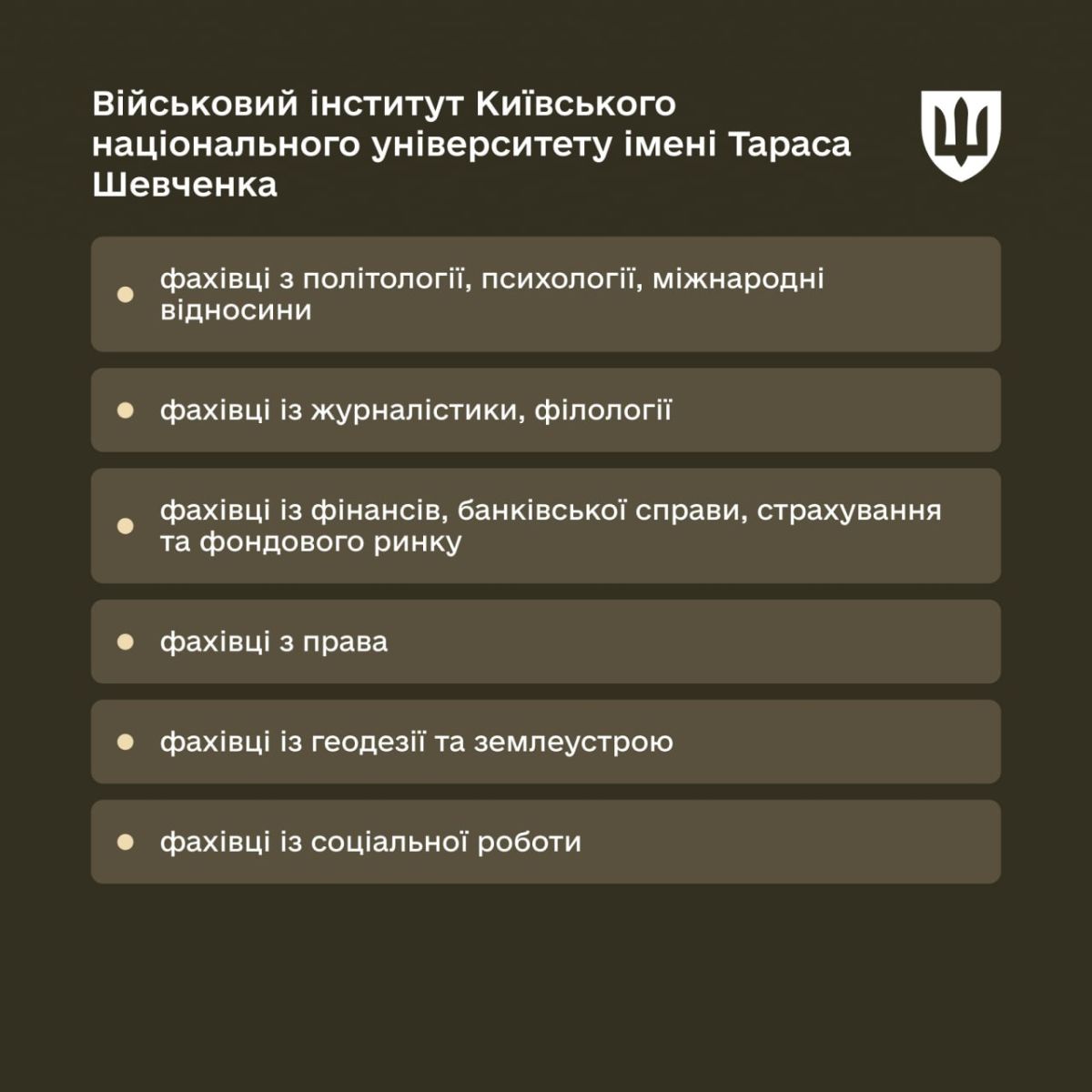 - Военный институт КНУ имени Тараса Шевченко – специальности: политология, психология, международные отношения, журналистика, право, финансы, социальная работа, геодезия и землеустройство.