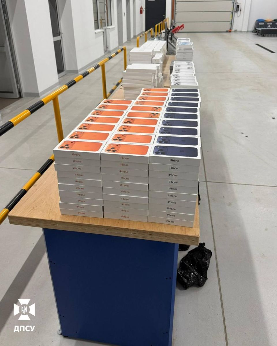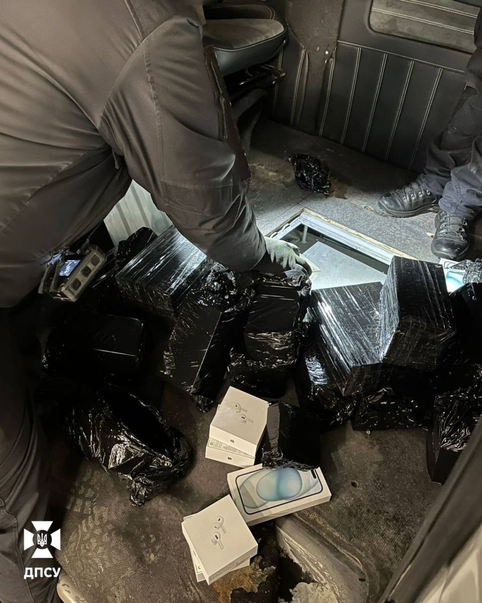 В специально оборудованном тайнике в днище микроавтобуса обнаружили мобильные телефоны iPhone моделей 15, 16 и 17, а также смарт-часы и наушники Apple. Всего из тайника извлекли 829 единиц техники. Ориентировочная стоимость изъятого превышает 35 млн гривен.
