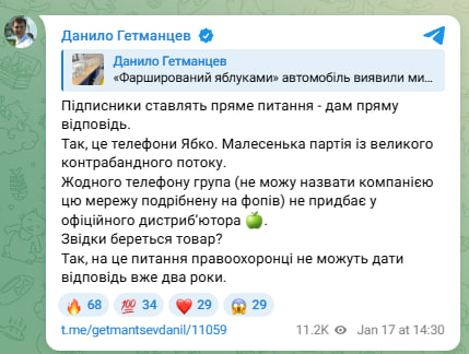 «Подписчики задают прямой вопрос – я дам прямой ответ. Да, это телефоны Ябко. Крошечная партия из большого контрабандного потока. Ни один телефон группа (не могу назвать компанией эту сеть, раздробленную на ФЛП) не приобретет у официального дистрибьютора. Откуда берется товар? Да, на этот вопрос правоохранители не могут дать ответ уже два года», – добавил Гетманцев.