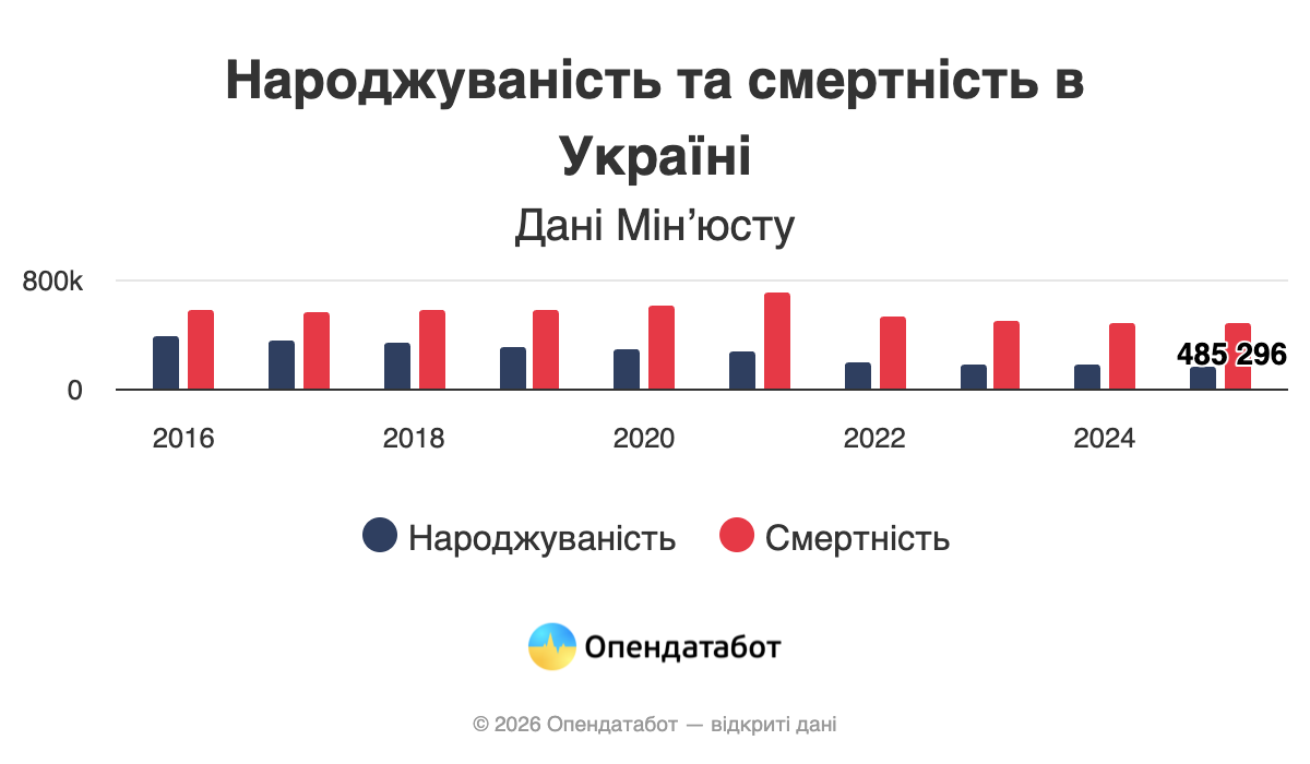 В то же время в 2025 году в Украине зарегистрировано 485 296 смертей. Общий уровень смертности по стране снизился на 2%, однако демографический баланс сейчас таков: на одного новорожденного приходится трое умерших.