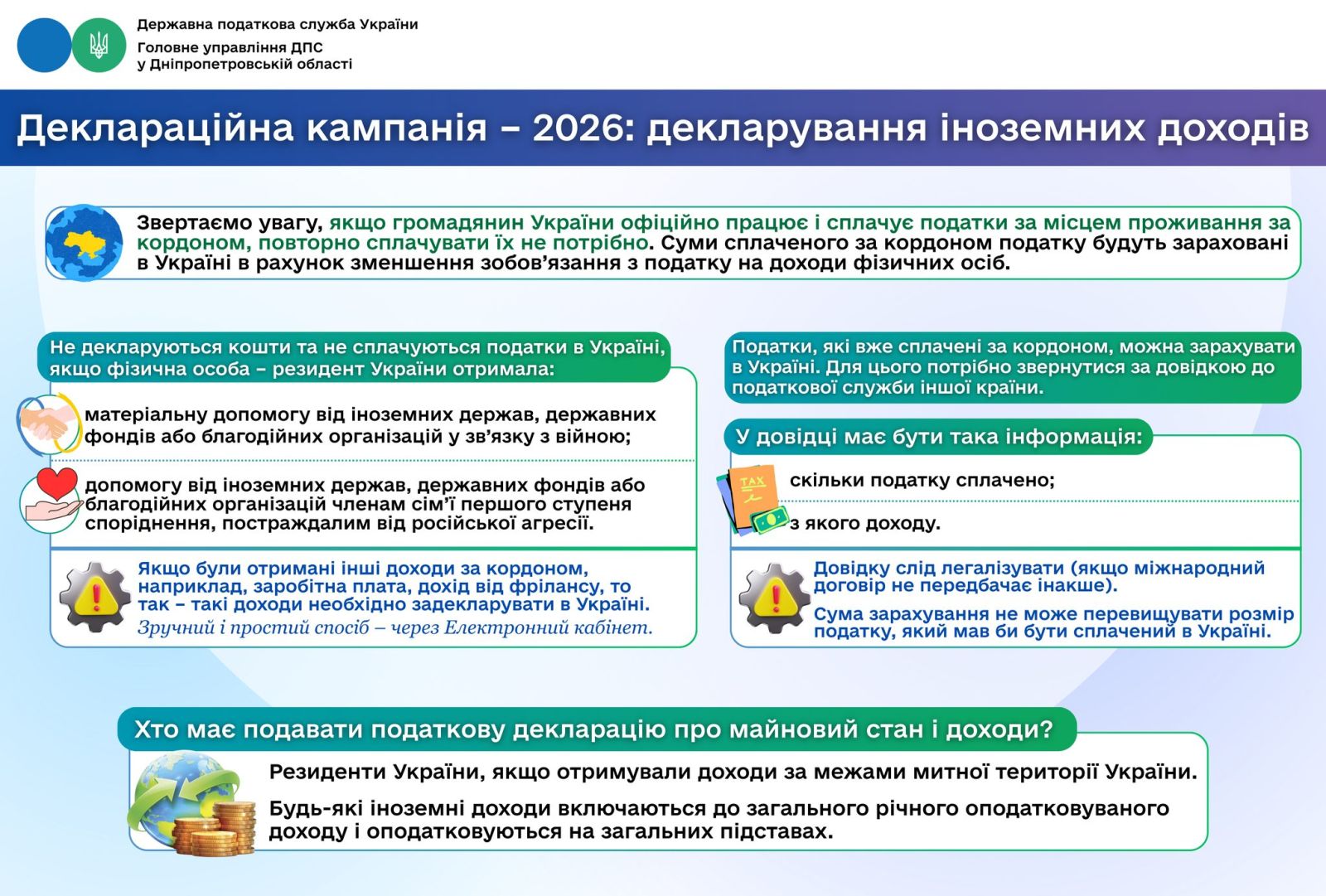В рамках декларационной кампании–2026 украинцам, которые в 2025 году получали доходы за границей, необходимо учитывать особенности их декларирования и налогообложения в Украине. Об этом напоминает Государственная налоговая служба.