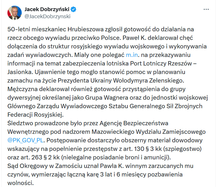 В Польше суд признал виновным в шпионаже в пользу российской разведки 50-летнего Павла К., который в 2024 году участвовал в подготовке покушения на президента Украины Владимира Зеленского. Об этом сообщил спикер координатора польских спецслужб Яцек Добжинский.