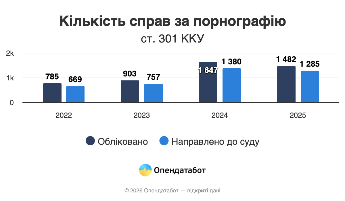 В 2025 году в Украине открыли 1482 уголовных производства, связанных с оборотом контента 18+. Это примерно на 10% меньше, чем годом ранее. Об этом свидетельствует аналитика Опендатабот.
