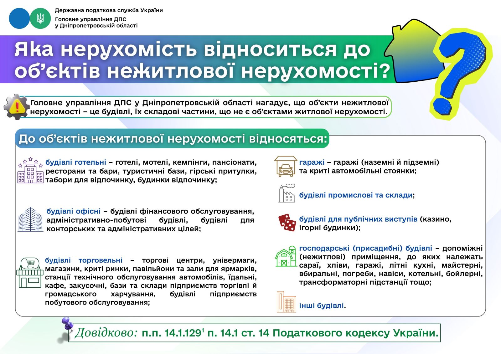 Главное управление ГНС в Днепропетровской области разъяснило, какие объекты относятся к нежилой недвижимости и подлежат налогообложению. Речь идет о зданиях и их составных частях, которые не используются для проживания, а имеют коммерческое, хозяйственное, производственное или иное функциональное назначение. Налоговики привели перечень основных категорий такой недвижимости.