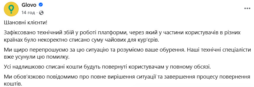 После резонанса в соцсетях Glovo опубликовала заявление на своей странице в Facebook, признав технический сбой и заверив, что все некорректно списанные средства будут компенсированы в полном объеме.