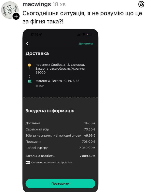 По словам клиентов, после оформления заказа сервис автоматически увеличивал сумму чаевых. Вместо 50–100 грн с банковских карт списывались тысячи гривен.