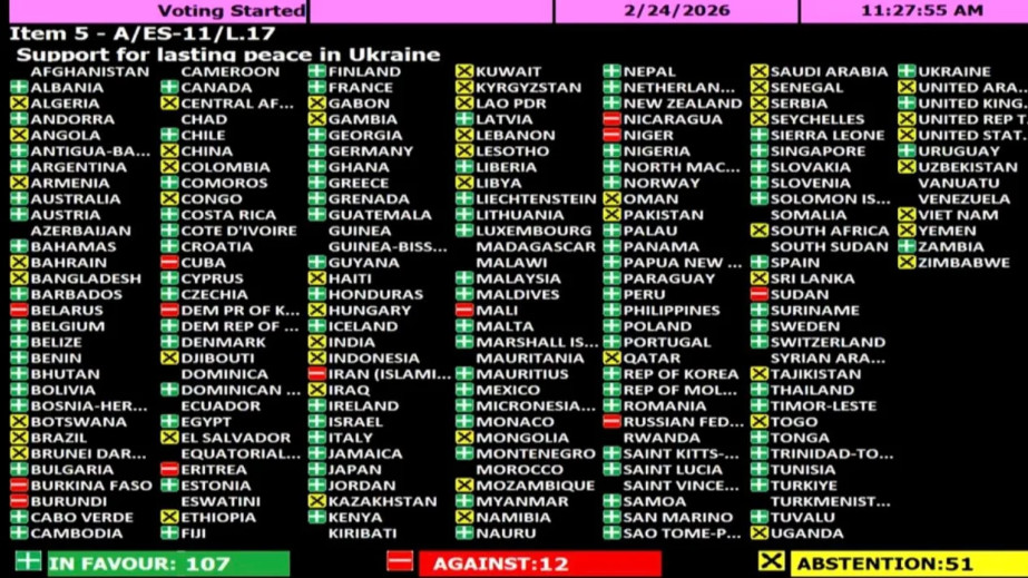 За резолюцию проголосовали 107 стран, воздержались — 51. Против резолюции проголосовали Россия, Беларусь, Буркина-Фасо, Бурунди, Куба, Северная Корея, Эритрея, Иран, Мали, Никарагуа, Нигер и Судан. США воздержались.