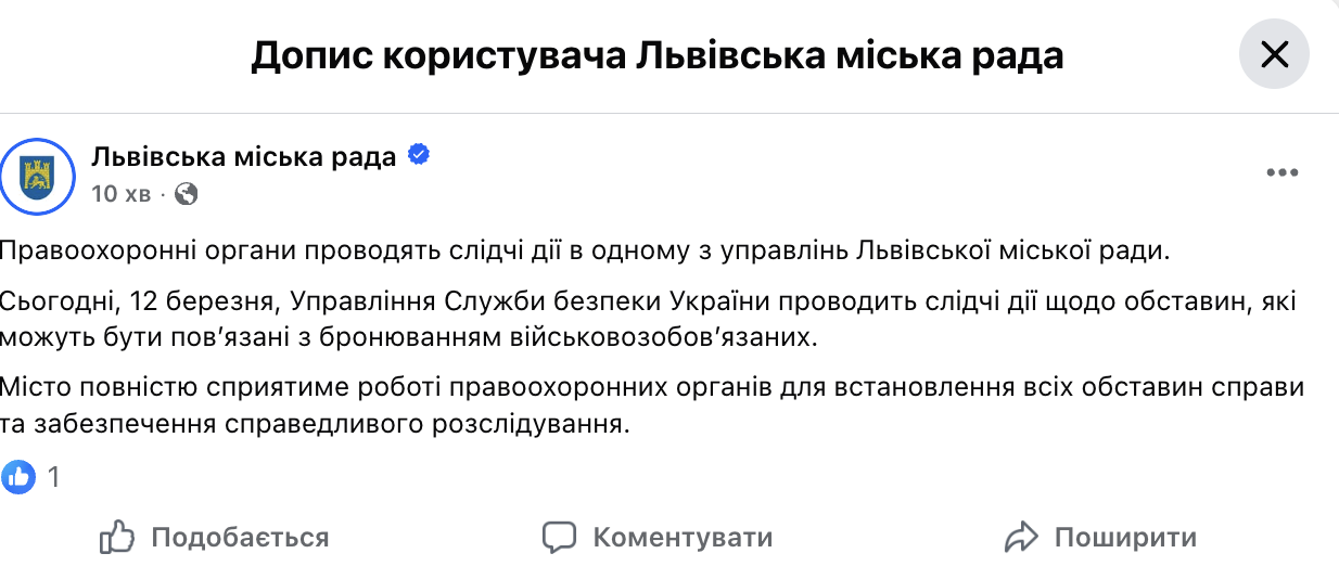Как сообщили в городском совете, 12 марта Управление Службы безопасности Украины проводит следственные действия по обстоятельствам, которые могут быть связаны с бронированием военнообязанных.