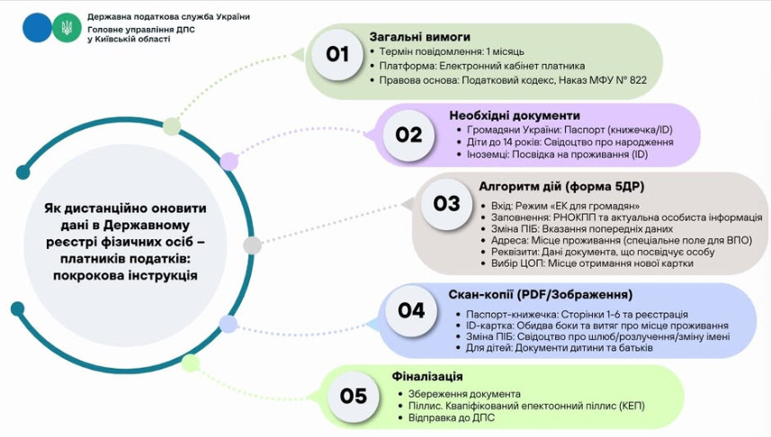 Главное управление ГНС в Киевской области напомнило, что в случае изменения личных данных — фамилии, имени, отчества, места проживания или других сведений — граждане обязаны сообщить об этом налоговым органам в течение одного месяца. Обновить информацию можно без посещения налоговой, воспользовавшись электронными сервисами ГНС.