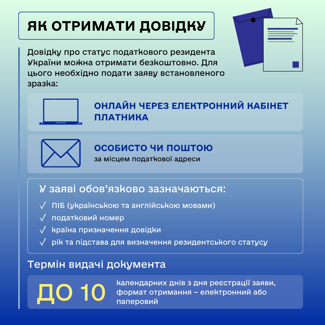 Получить справку можно бесплатно, подав заявление установленного образца онлайн через Электронный кабинет плательщика или лично либо по почте в налоговый орган по месту регистрации. В заявлении обязательно указываются ФИО на украинском и английском языках, налоговый номер, страна назначения справки, год и основание для определения резидентского статуса. Срок выдачи документа – до 10 календарных дней, формат – электронный или бумажный.