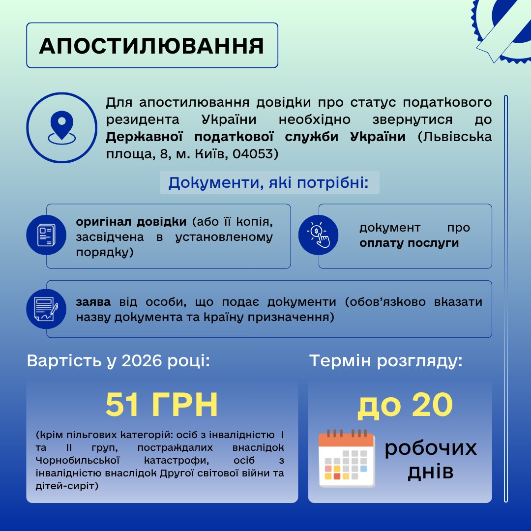 Государственная налоговая служба в Полтавской области напоминает о порядке получения справки о налоговом резидентском статусе и ее апостилировании для использования за рубежом.