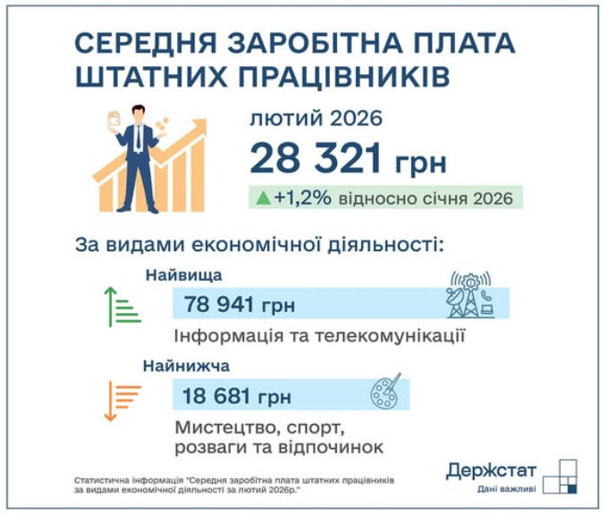 Отмечается, что в феврале 2026 года средняя заработная плата штатных работников по Украине составила 28 321 грн против 27 975 грн в январе (+1,2%).