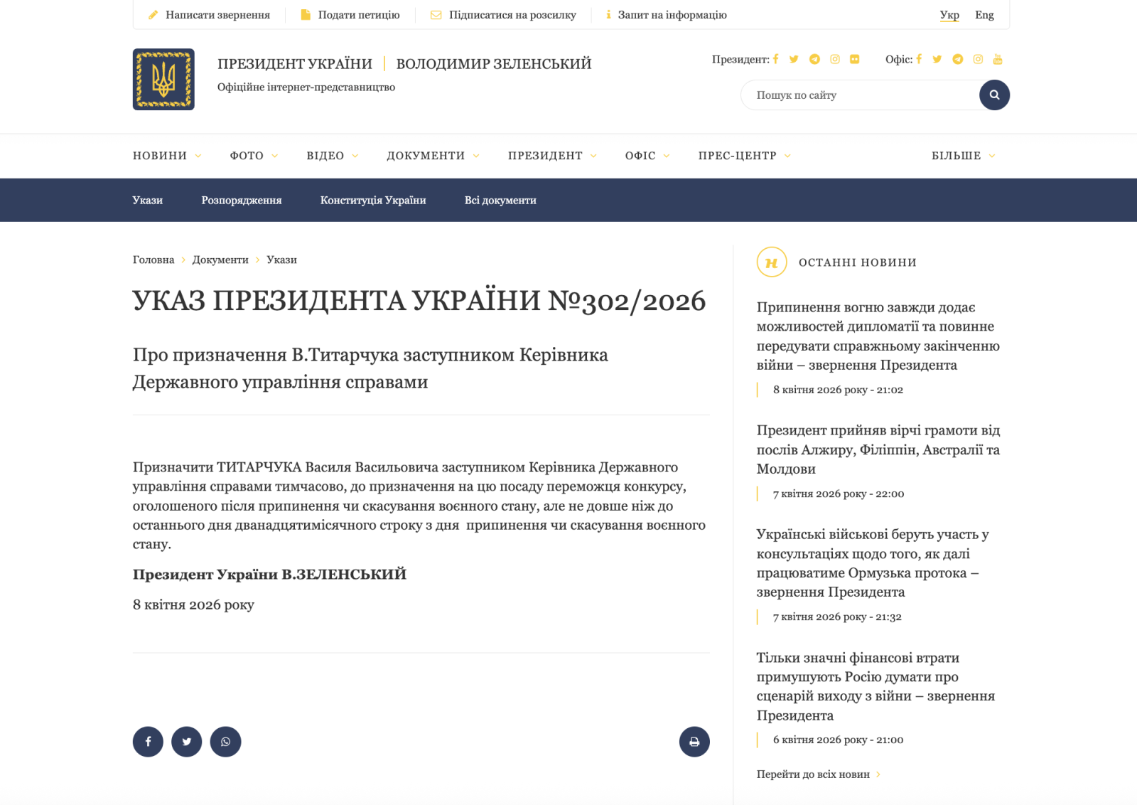 Президент Украины Владимир Зеленский подписал указ № 302/2026 о назначении Василия Титарчука заместителем руководителя Государственного управления делами.