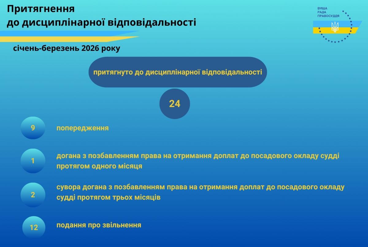 В течение первого квартала 2026 года Дисциплинарные палаты Высшего совета правосудия привлекли к дисциплинарной ответственности 24 судей. Об этом сообщили в ВСП.