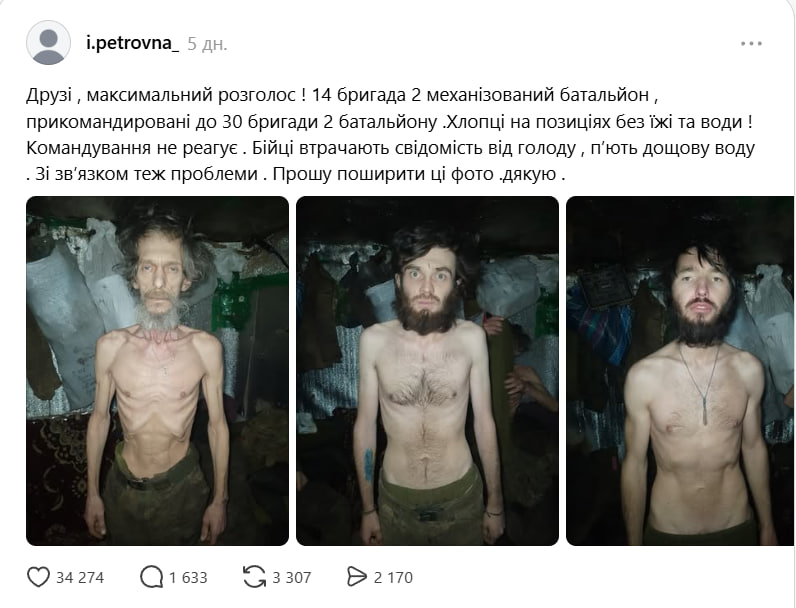 Напомним, в социальных сетях появились фотографии четырёх военнослужащих 14-й механизированной бригады имени князя Романа Великого, входящей в состав Сухопутных войск и 10-го армейского корпуса. По имеющейся информации, они более восьми месяцев находятся на позициях Купянского направления и, по словам родственников, испытывали проблемы с обеспечением едой и водой. Впоследствии близкие военных уточнили, что критические трудности с снабжением начались с января, и об этом они обращались в соответствующие структуры.