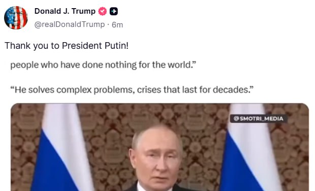 «Дякую президенту Путіну!» — зазначив Трамп у своїй соцмережі Truth Social, додавши скріншот із цитатою Путіна про Трампа: «Він вирішує складні проблеми, кризи, що тривають десятиліттями».