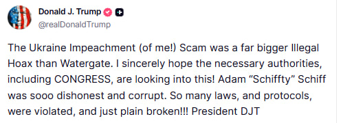 «Скандал з імпічментом в Україні (проти мене!) був набагато більшим незаконним обманом, ніж Вотергейт. Я щиро сподіваюся, що необхідні органи, включно з Конгресом, розслідують це! Адам «Schiffty» Шифф був дуже нечесним і корумпованим. Було порушено та просто зламано так багато законів і процедур!!!», — написав Трамп.