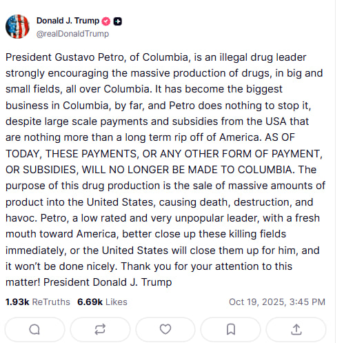 «Президент Колумбії Густаво Петро є лідером незаконного наркобізнесу, який активно заохочує масове виробництво наркотиків на великих і малих полях по всій Колумбії. Це стало найбільшим бізнесом в Колумбії, і Петро нічого не робить, щоб це зупинити, незважаючи на великі виплати і субсидії від США, які є нічим іншим, як довгостроковим обкраданням Америки. З сьогодні, ці виплати, або будь-які інші форми виплат, або субсидії, більше не будуть здійснюватися Колумбії», — заявив Трамп.