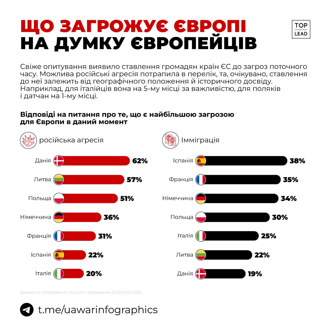 Згідно з даними опитування YouGov, оприлюдненими на інфографіці Top Lead, найбільше занепокоєння висловлюють жителі Данії — 62% опитаних вважають Росію серйозною небезпекою для Європи. У Польщі таку думку поділяють 51% респондентів, у Литві — 57%.