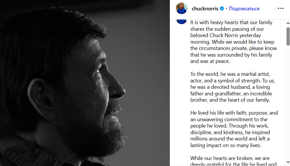 Сім’я вирішила не розголошувати конкретні обставини та причини трагедії, наголосивши на бажанні зберегти приватність у цей важкий час. Родичі зазначили, що Чак Норріс пішов із життя з миром, до останнього залишаючись серцем своєї великої родини. Про сумну звістку стало відомо з офіційної заяви родини Норріс.