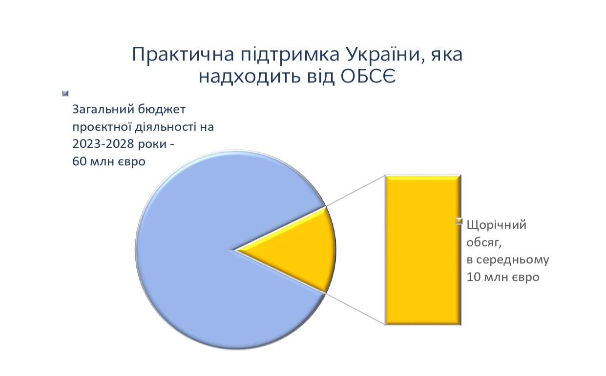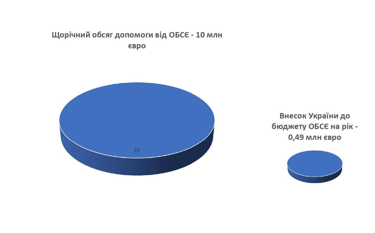 Щороку близько 10 млн євро спрямовується на реалізацію проєктів ОБСЄ в Україні. При цьому внесок України до бюджету Організації становить менш ніж 0,5 млн євро на рік.