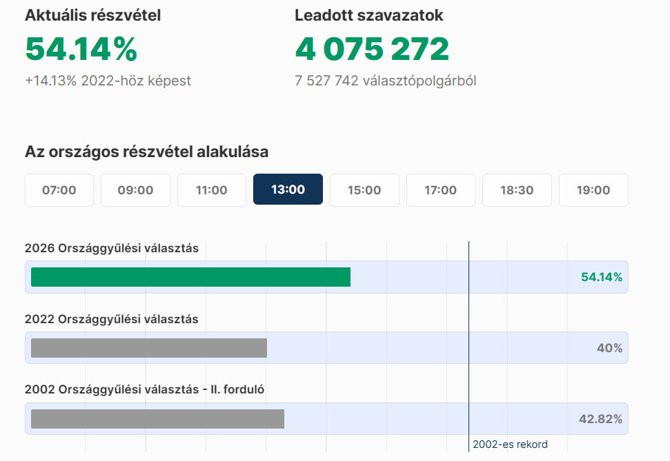 Станом на 13:00 участь у голосуванні взяли 54,14% громадян, що на 14,14% більше, ніж на аналогічний час під час виборів 2022 року. Про це повідомляє видання Telex.