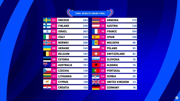 Швеція перемогла у Євробаченні-2023, Україна посіла 6 місце