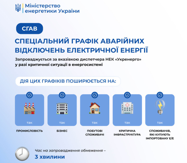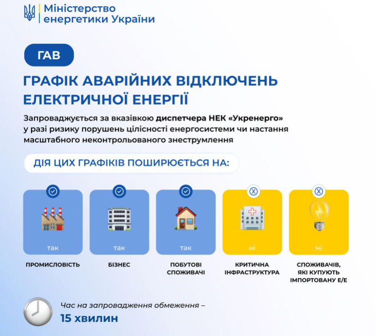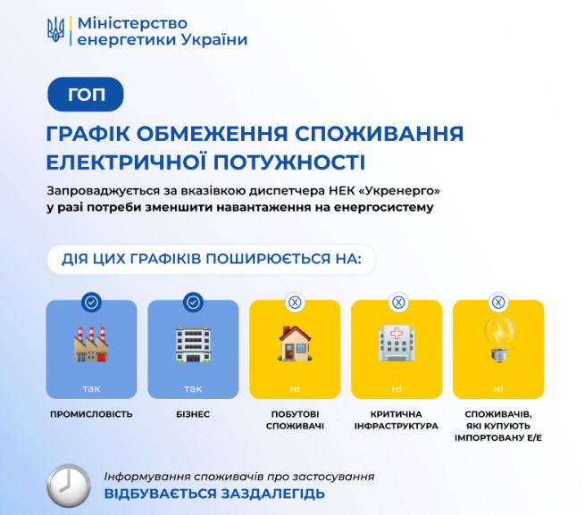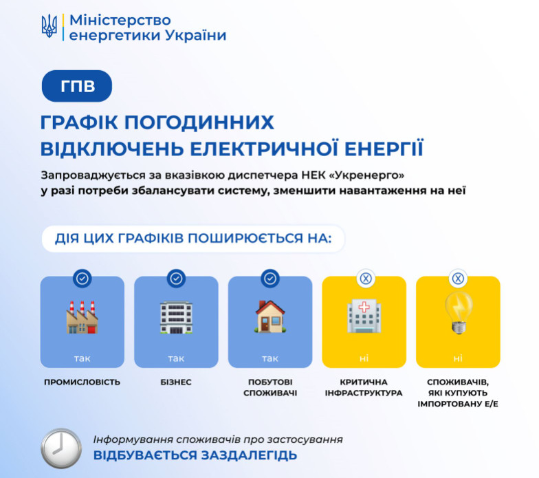 У Міненерго підкреслюють, що інфографіки нижче допоможуть розібратись, кого саме стосуються ті чи інші графіки і в яких випадках вони застосовуються.