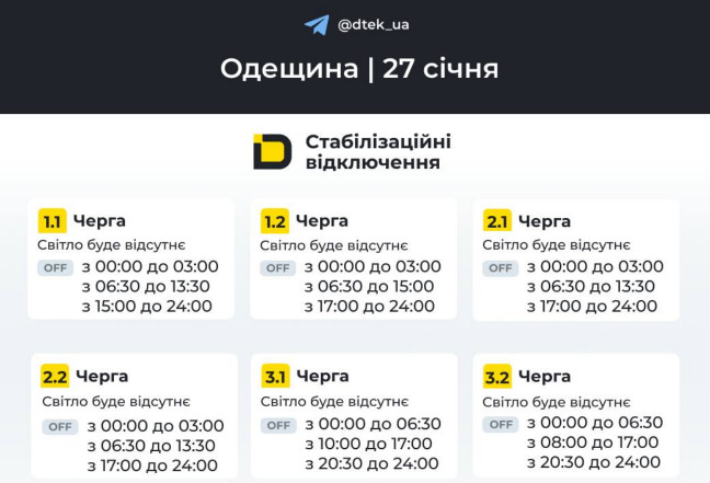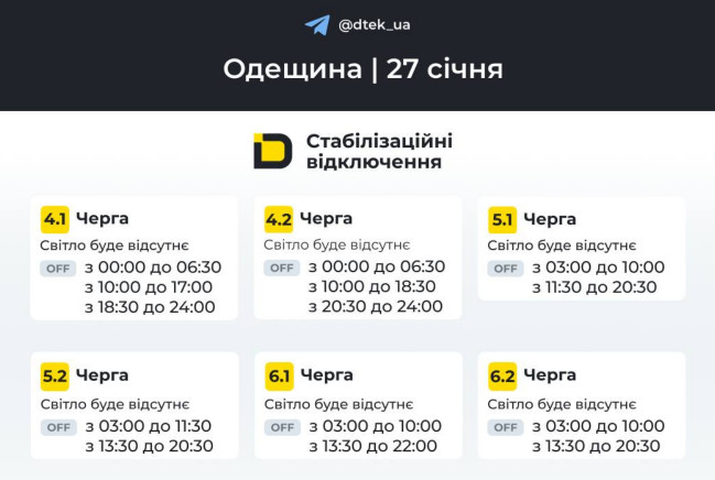 Як вимикатимуть світло на Одещині 27 січня — ДТЕК оприлюднив графіки