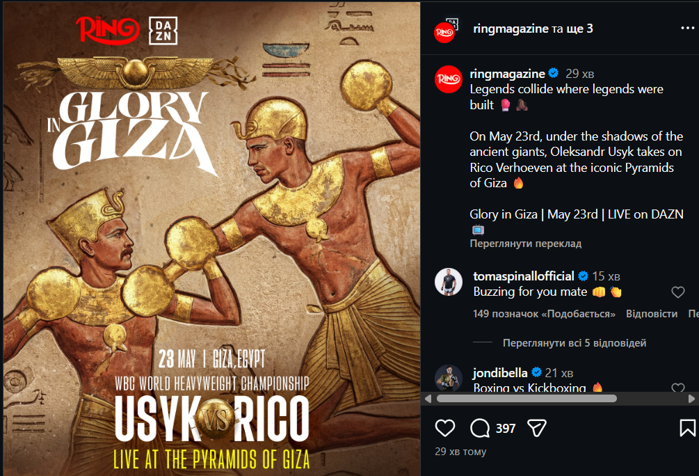Поєдинок заплановано на 23 травня. Ареною бою стане Гіза в Єгипті. На кону — титул WBC у надважкій вазі, яким нині володіє український боксер.