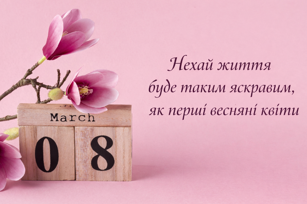 Зі святом — Міжнародним жіночим днем! Нехай ваше життя буде таким же яскравим, як перші весняні квіти, і таким же теплим, як сонячні промені. Бажаємо щастя, любові, добробуту та гармонії. Нехай кожна мить приносить радість і натхнення.