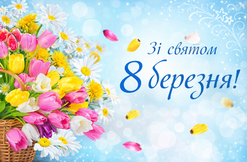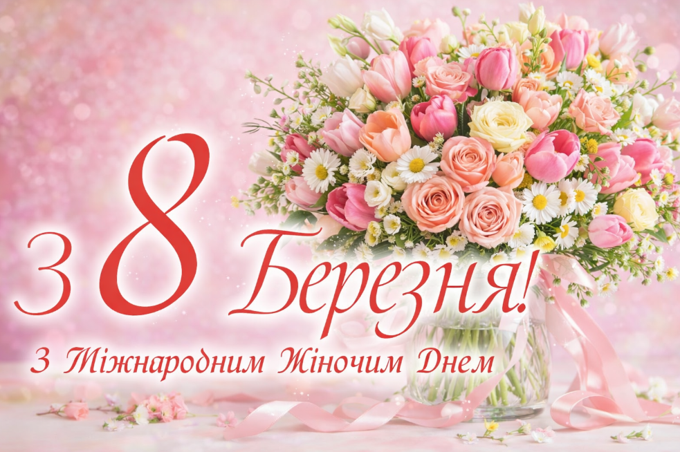 З Міжнародним жіночим днем! Бажаємо вам миру, добра, любові та благополуччя. Нехай ваше життя буде наповнене щасливими подіями, приємними зустрічами і гарними новинами. Нехай весна принесе нові мрії, а кожен день дарує радість і натхнення.