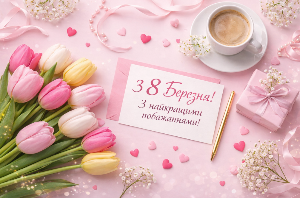 Щиро вітаємо з 8 березня! Бажаємо, щоб весна принесла у ваше життя нові сили, впевненість і віру у найкраще. Нехай здійснюються всі мрії, а кожен день дарує приводи для радості. Нехай у домі завжди панують тепло, затишок і любов.