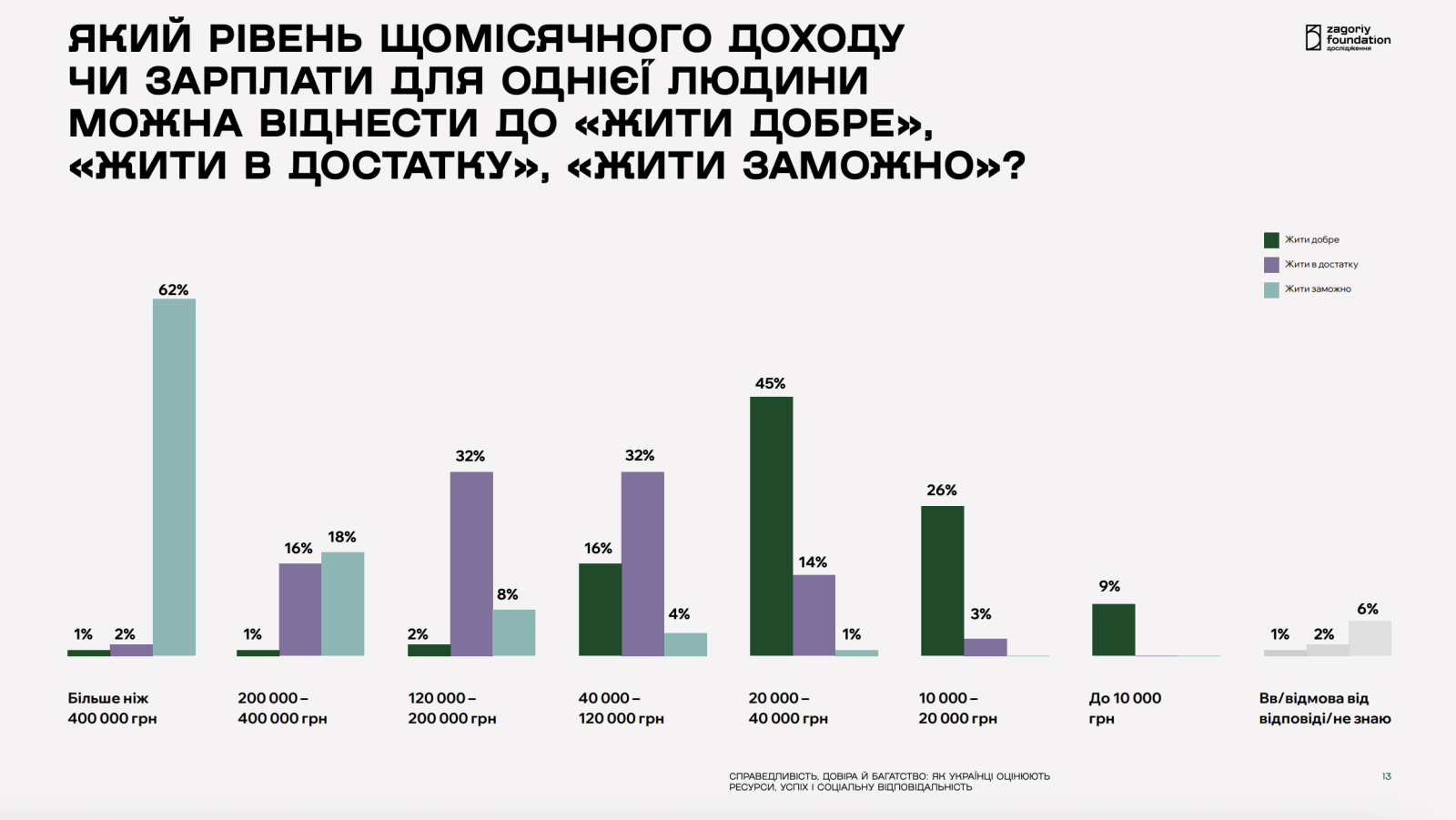 Натомість поняття «жити заможно» більшість пов’язує зі значно вищими доходами. Так, 62% опитаних вважають, що для цього необхідно отримувати понад 400 тис. грн на місяць. Ще 18% називають рівень 200–400 тис. грн.