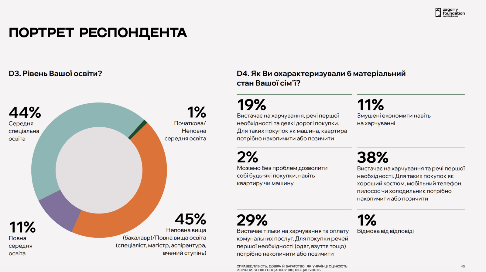 Щодо рівня освіти, найбільша частка респондентів має вищу або неповну вищу освіту (45%), ще 44% — середню спеціальну, 11% — повну середню.