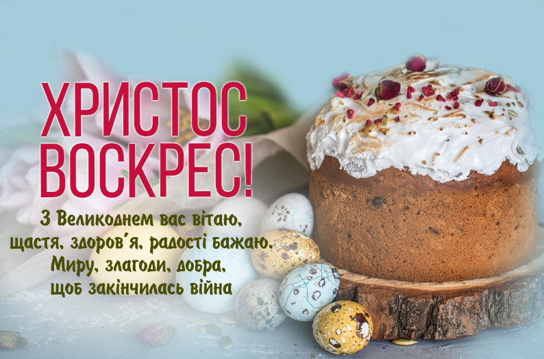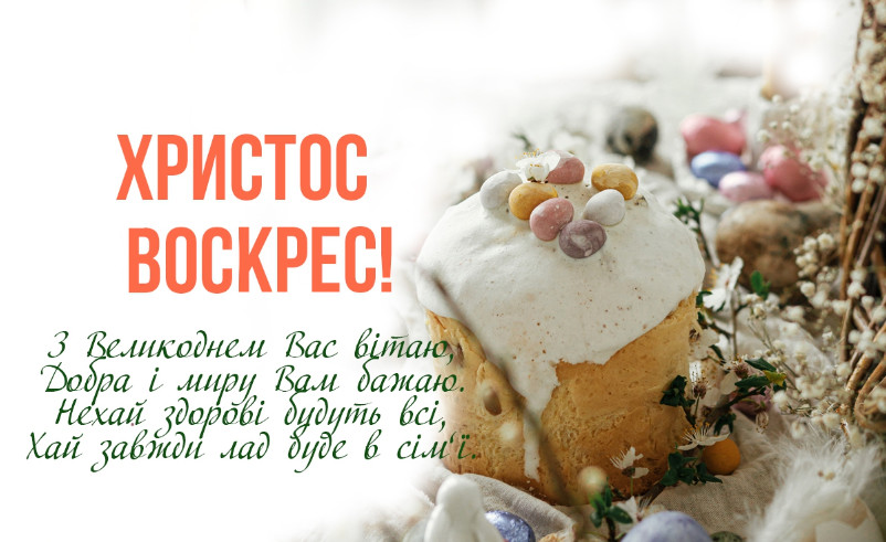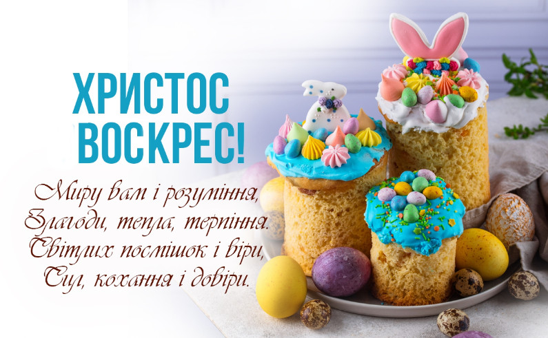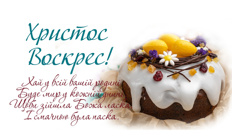 Вітаємо Вас зі світлим святом Христового Воскресіння! Нехай передзвін великодніх дзвонів принесе Вам лише благі звістки, нехай серце Ваше наповниться радістю, нехай віра допомагає Вам долати труднощі.