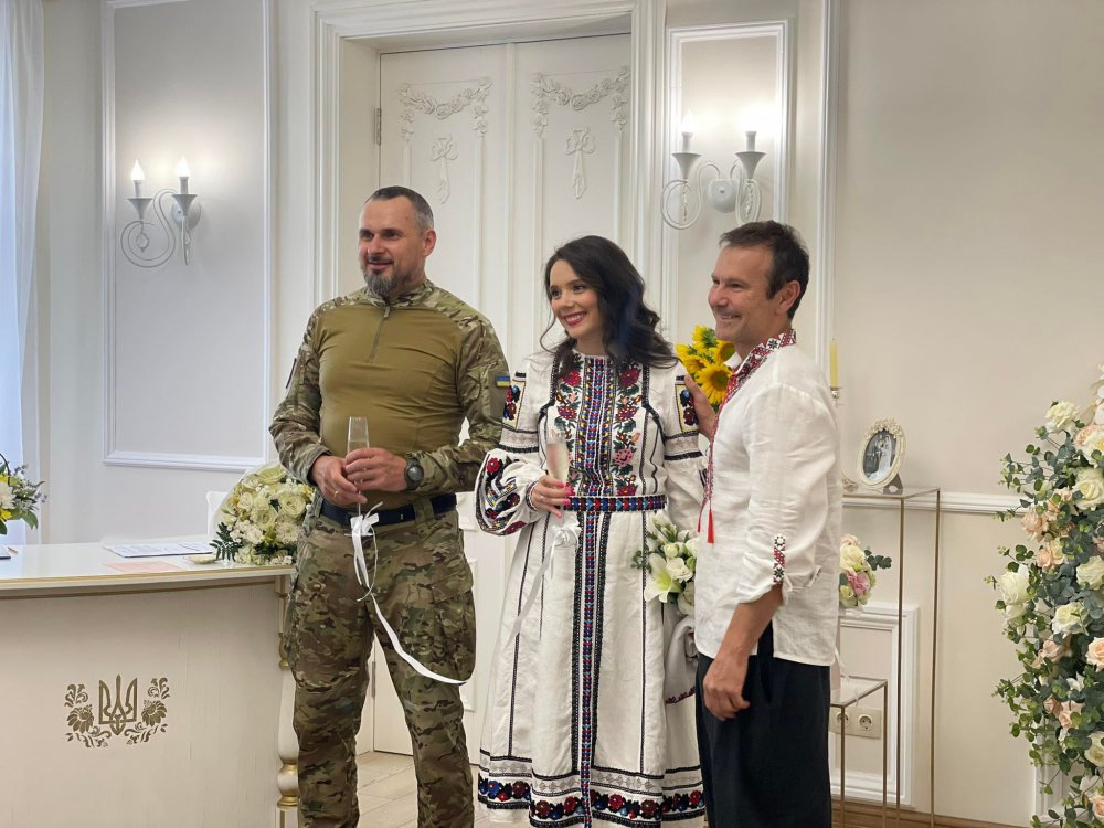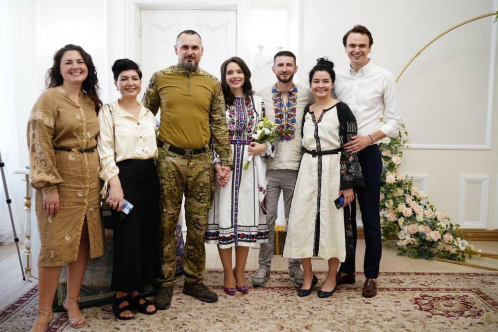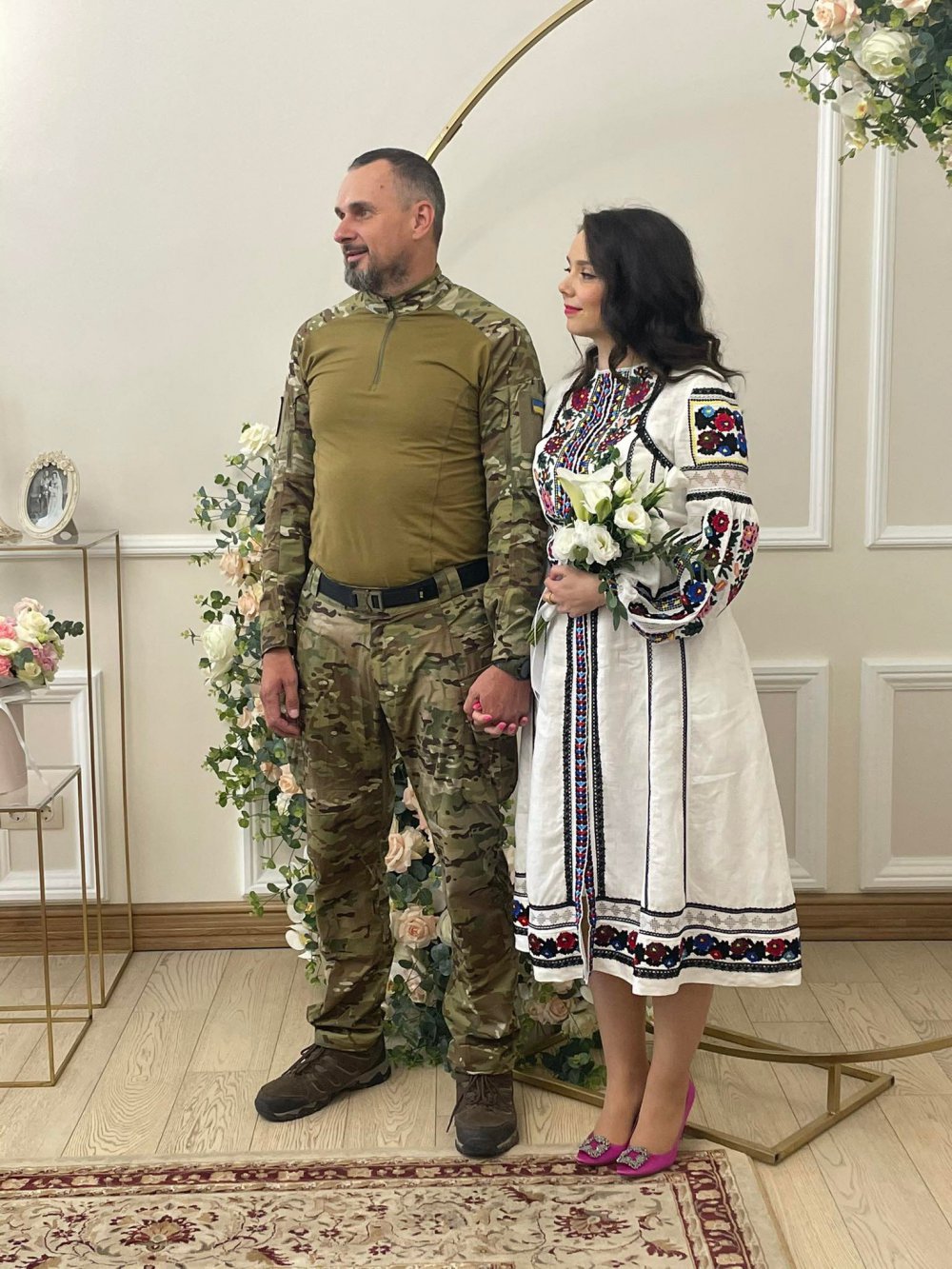 На фото Сенцов одягнений у військову форму, а його дружина – у вишитій сукні з квітами. Серед гостей присутній Святослав Вакарчук.