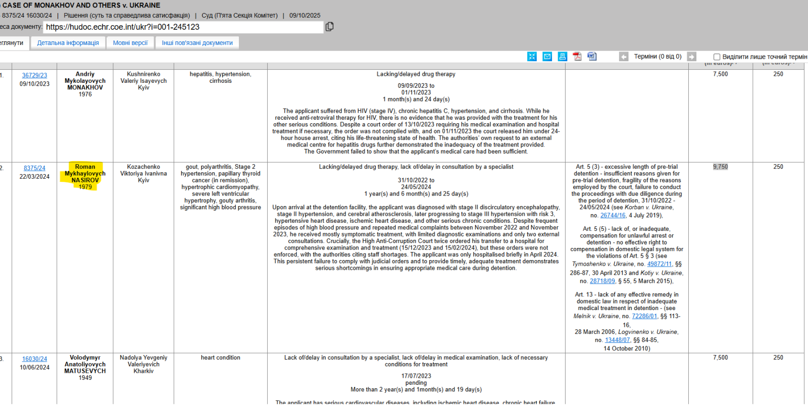 Так, ЄСПЛ об’єднав групу заяв, серед яких і скарга Романа Насірова. Заявники стверджували, що вони не отримували належної медичної допомоги під час тримання під вартою (заяви об’єднані у справі «Монахов та інші проти України»).