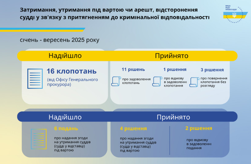 За результатами розгляду клопотань протягом січня - вересня 2025 року Вищої радою правосуддя ухвалено: