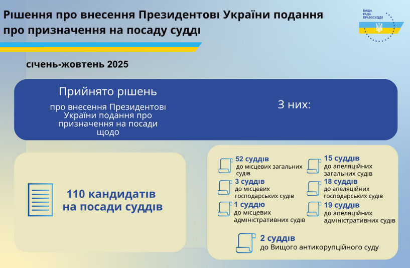 Упродовж січня – жовтня 2025 року Вища рада правосуддя ухвалила рішення про внесення Президентові України Володимиру Зеленському подання про призначення 110 кандидатів на посади суддів, з них: