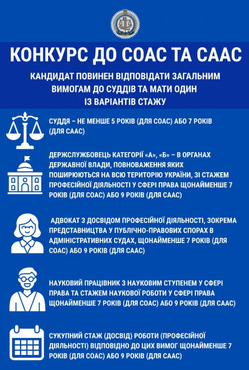 - держслужбовець категорії «А», «Б» – в органах державної влади, повноваження яких поширюються на всю територію України, зі стажем професійної діяльності у сфері права щонайменше 7 років (для СОАС) або 9 років (для СААС);