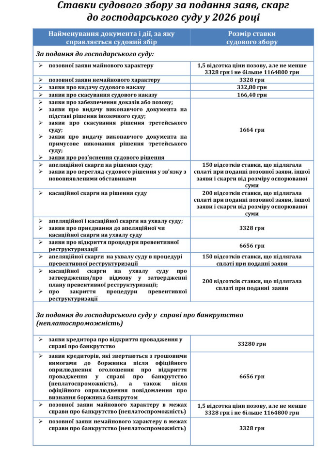 Якими будуть ставки судового збору за подання до господарського суду заяв та скарг у 2026 році