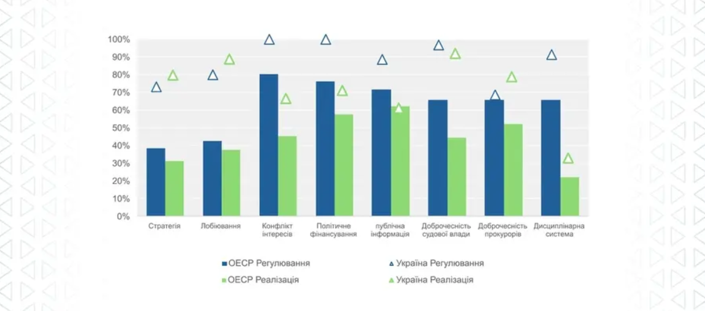 У межах стратегічної антикорупційної рамки Україна виконує 73% критеріїв регулювання та 80% — впровадження. Для порівняння, середній показник серед країн ОЕСР становить 38% і 32% відповідно.