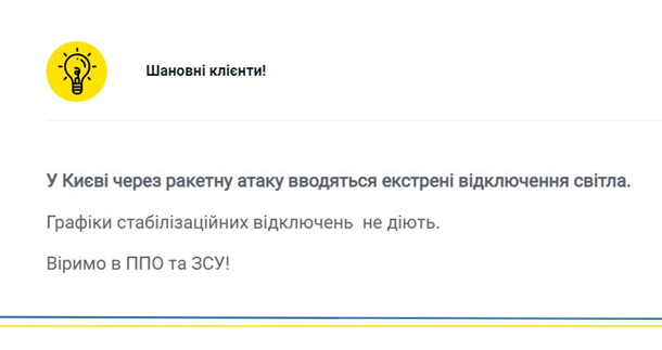 "У Києві через ракетну атаку вводяться екстрені відключення світла. Графіки стабілізаційних відключень не діють", - наголосили в компанії.