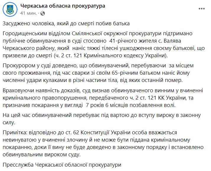 «Прокурором у суді доведено, що обвинувачений, перебуваючи за місцем свого проживання, під час сварки зі своїм 65-річним батьком наніс йому численні удари кулаками в різні частини тіла, від яких останній помер.