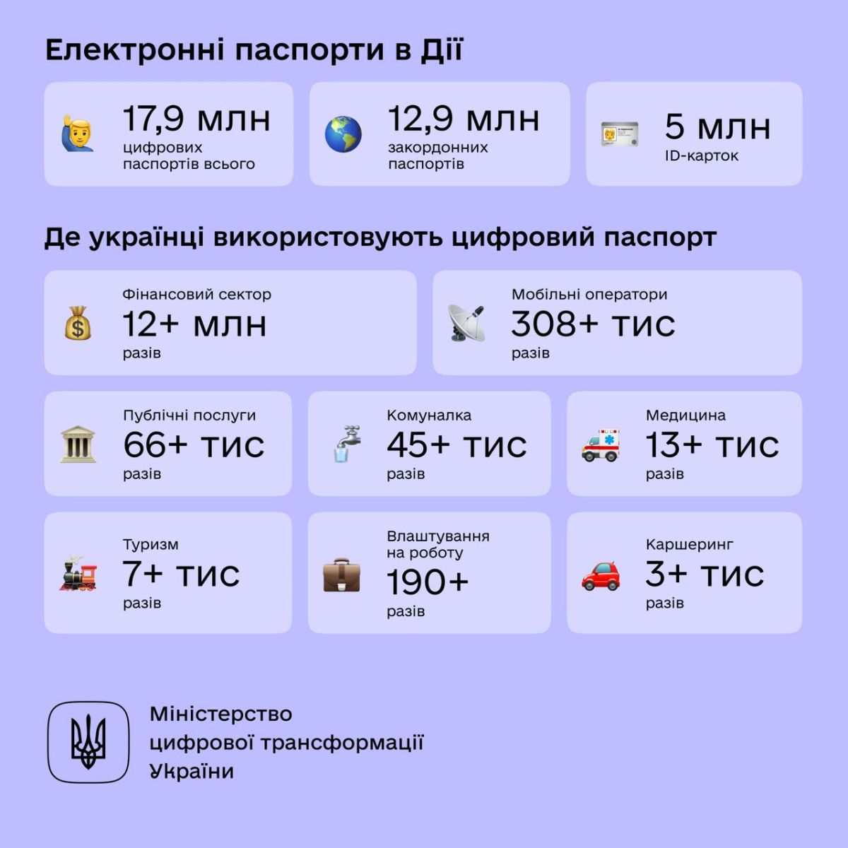 За два роки е-паспорт у Дії сформовано вже 17,9 млн разів. Так, у застосунку українці мають 5 млн ID-карток та 12,9 млн закордонних паспортів.